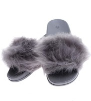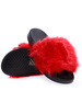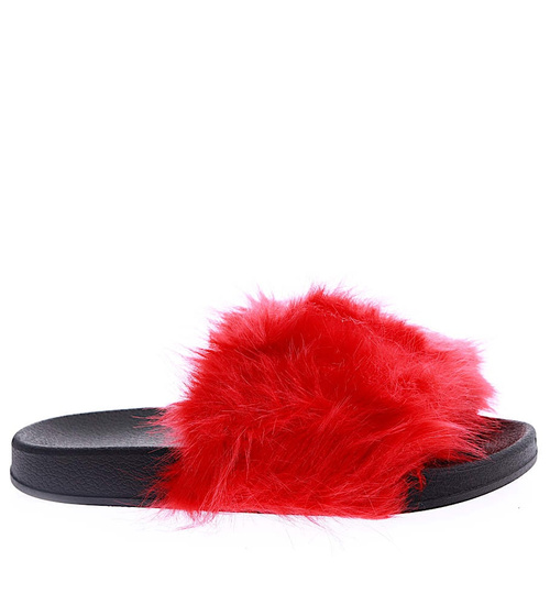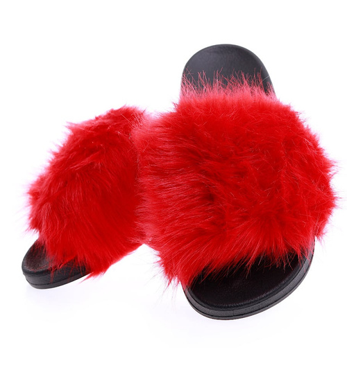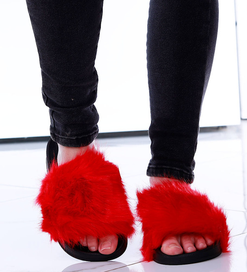 - Czerwone klapki damskie z futerkiem wykonane z miękkiego, przyjemnego w dotyku materiału.