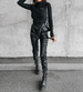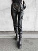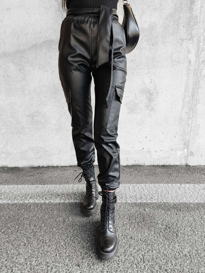 - Elastyczne damskie legginsy wykonane z elastycznej eko skórki w czarnym kolorze.