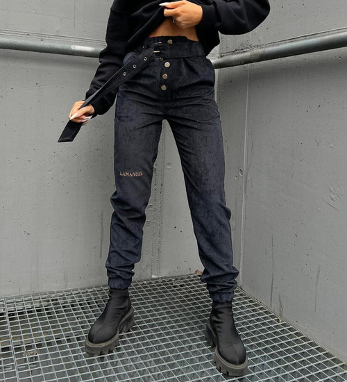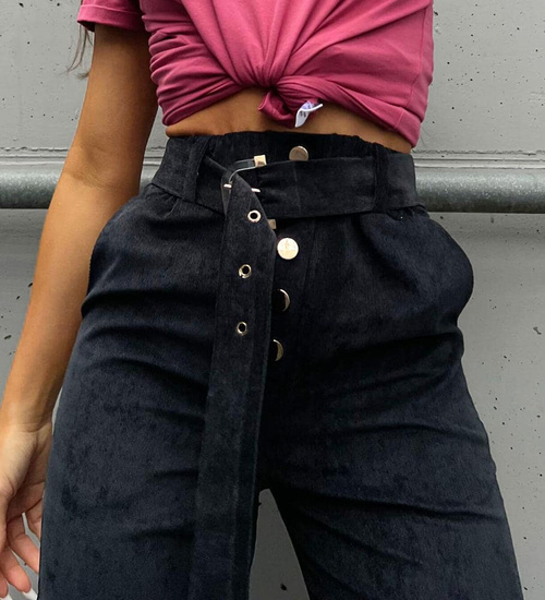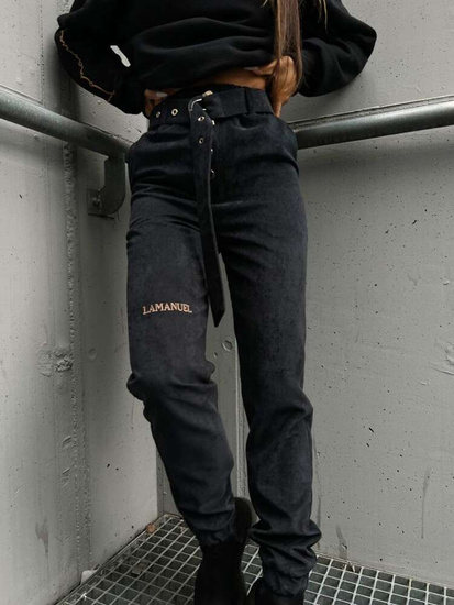 - Designerskie damskie spodnie z tkaniny sztruksowej marki LA MANUEL, łączą w sobie doskonałą kombinację elegancji.