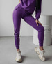 - Designerskie damskie spodnie dresowe wykonane z elastycznego materiału we fioletowym kolorze.