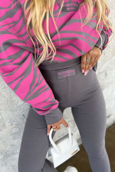 • Designerskie damskie legginsy wykonane z elastycznego materiału w szarym kolorze.