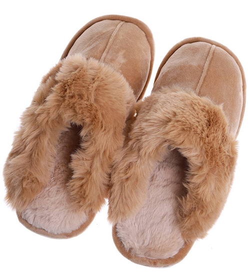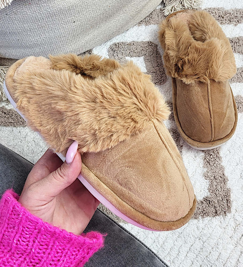 Pluszowe beżowe kapcie damskie z futerkiem /A2-1 15263 S147/