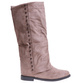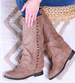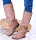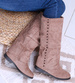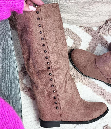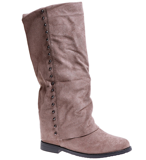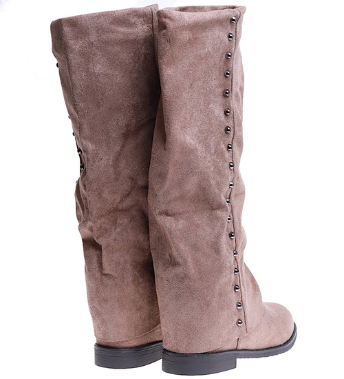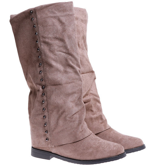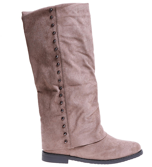- Casualowe damskie kozaki z ćwiekami wykonane z zamszowego materiału w kolorze khaki.
