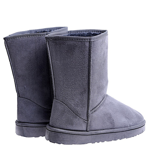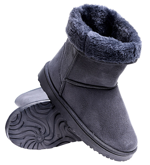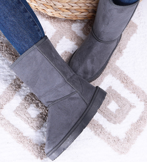- Zimowe kozaki mukluki wykonane z zamszowego materiału w szarym kolorze.