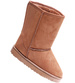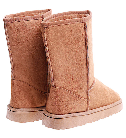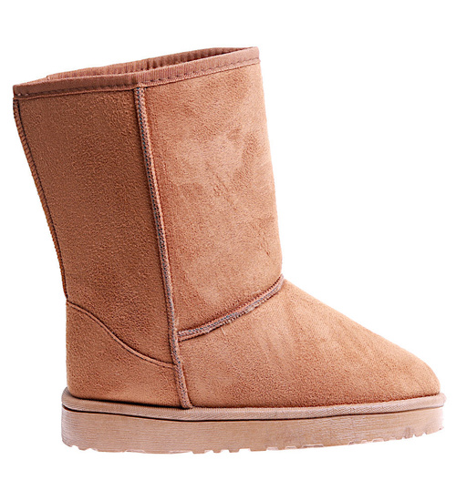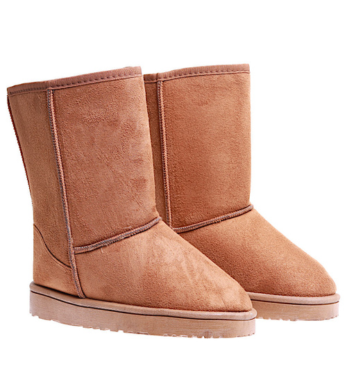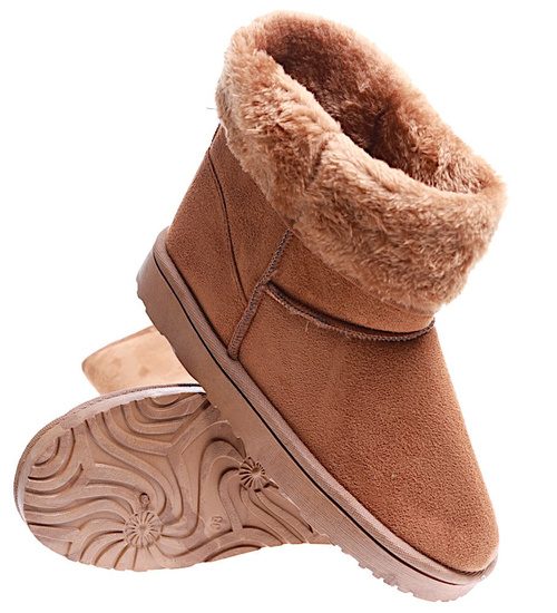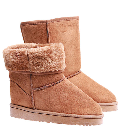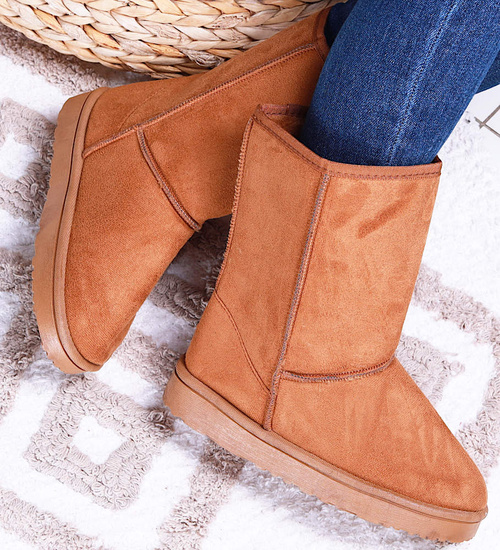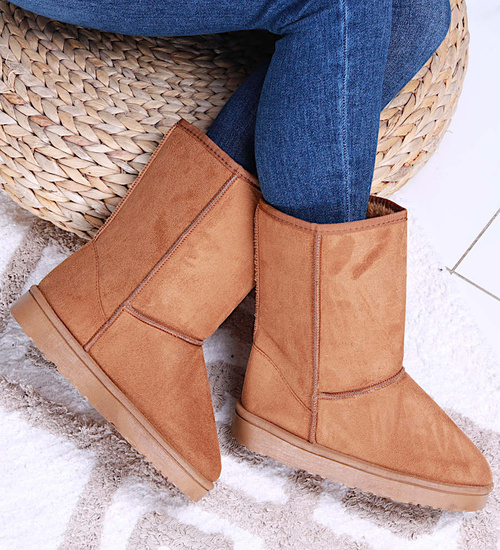 - Zimowe kozaki mukluki wykonane z zamszowego materiału w camelowym kolorze.
