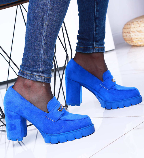 Modne niebieskie czółenka damskie na słupku i platformie /B6-2 15353 S487/