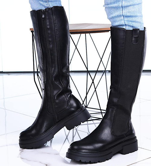 - Casualowe damskie kozaki wykonane z ekologicznej skóry w kolorze czarnym.