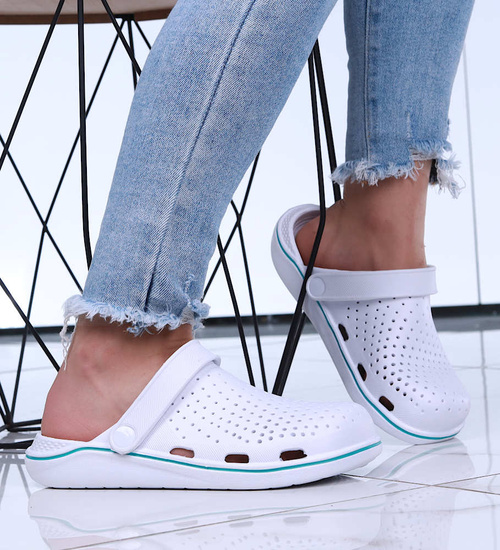 - Wodoodporne klapki damskie wykonane z lekkiego, gumowo piankowego materiał w białym kolorze.