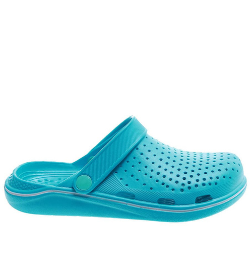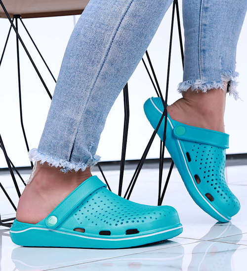 - Wodoodporne klapki damskie wykonane z lekkiego, gumowo piankowego materiał w turkusowym kolorze.