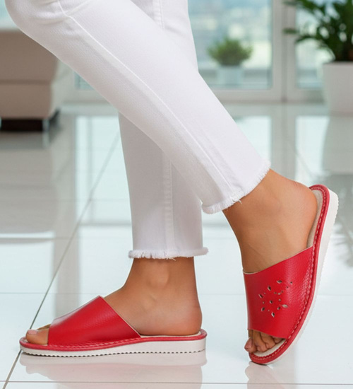 - Damskie pantofle domowe wykonane są z wysokiej jakości skóry ekologicznej w czerwonym kolorze.