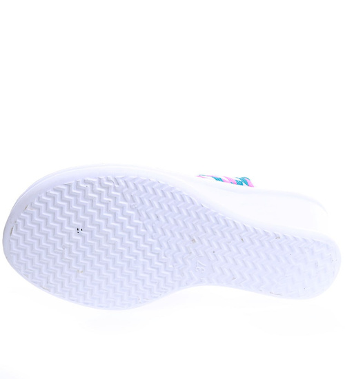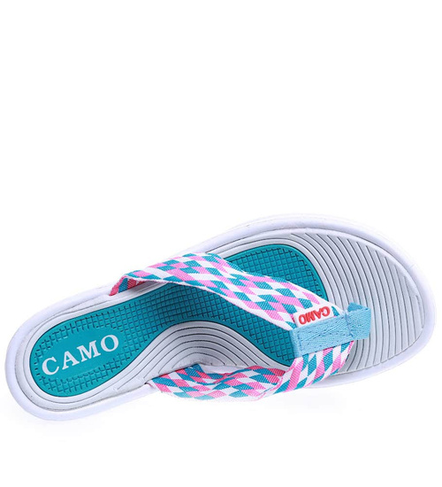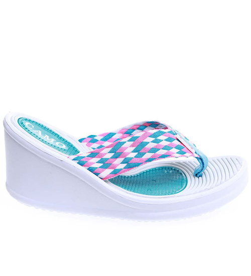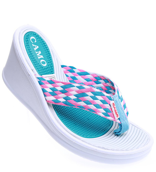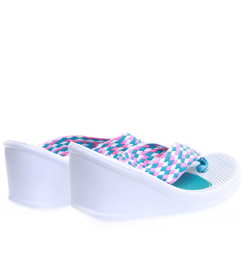 - Lekkie, turkusowe damskie japonki na koturnie o wakacyjnym charakterze.