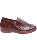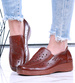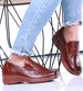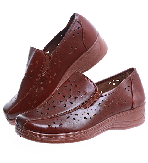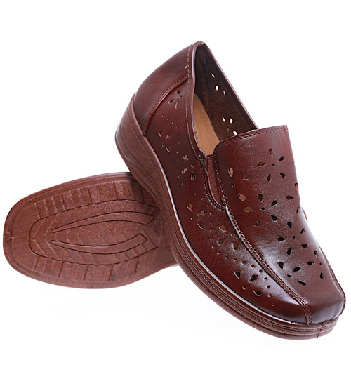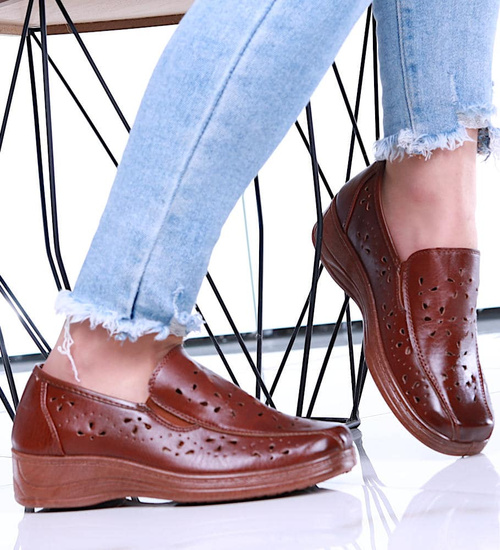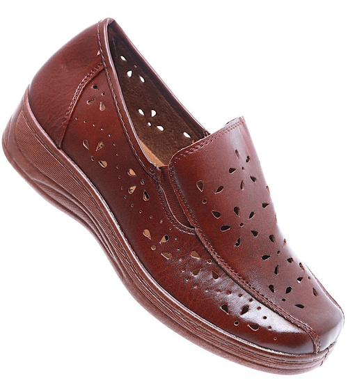 - Ażurowe wiosenne półbuty wykonane z miękkiej skórki ekologicznej w brązowym kolorze.