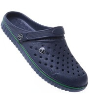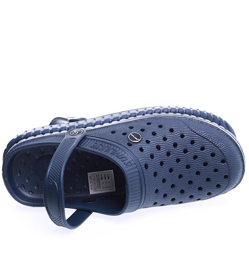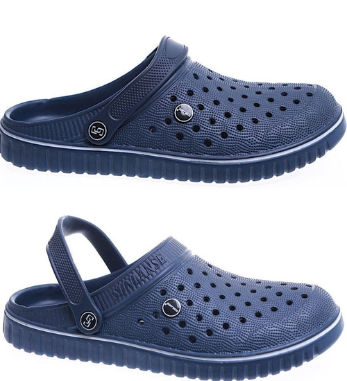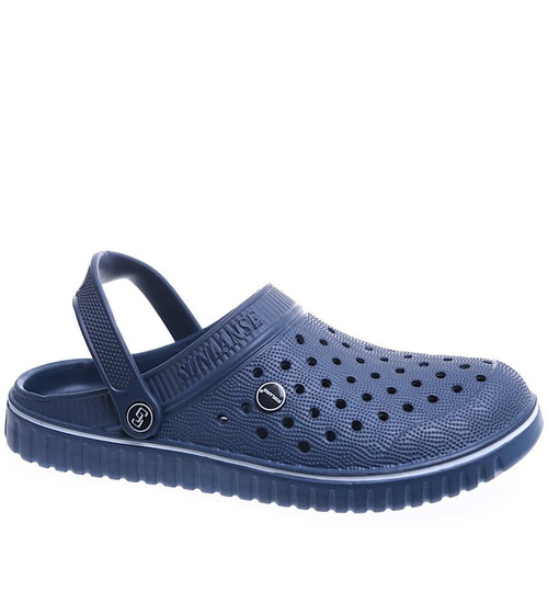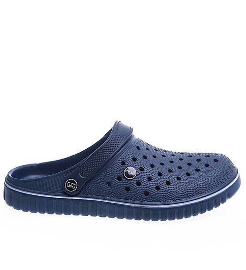 • Wodoodporne męskie klapki wykonane z gumowo piankowego materiału w kolorze granatowym.