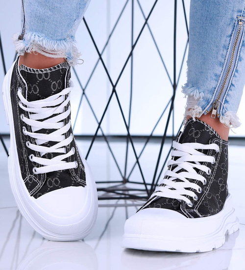 - Wygodne damskie trampki wykonane z miękkiego materiału w czarnym kolorze.