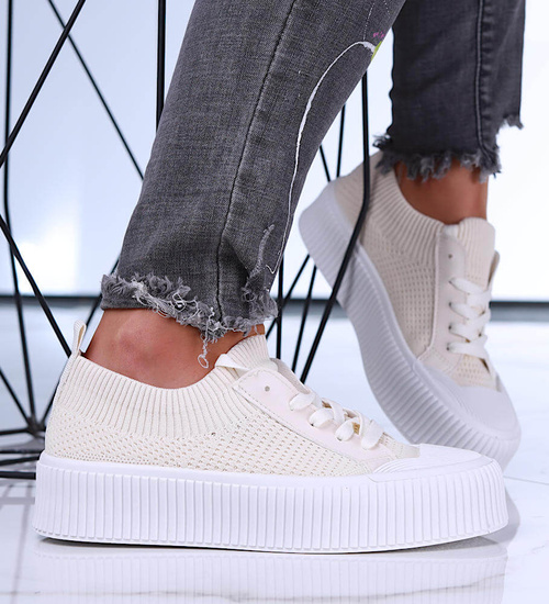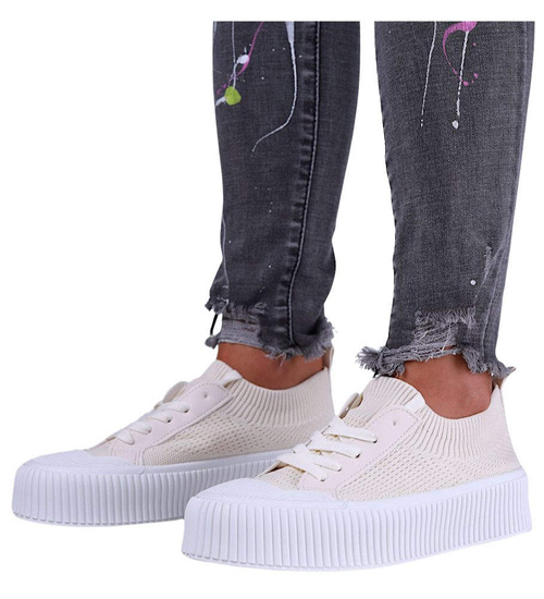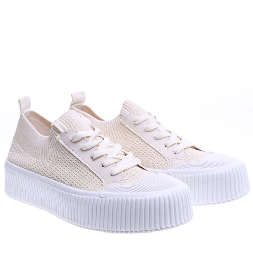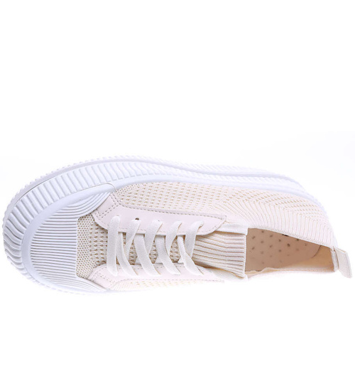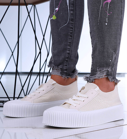 • Komfortowe damskie trampki wykonane z miękkiego materiału w beżowym kolorze.