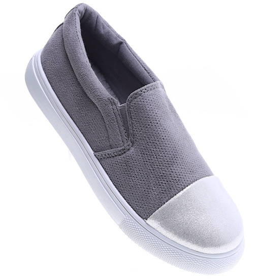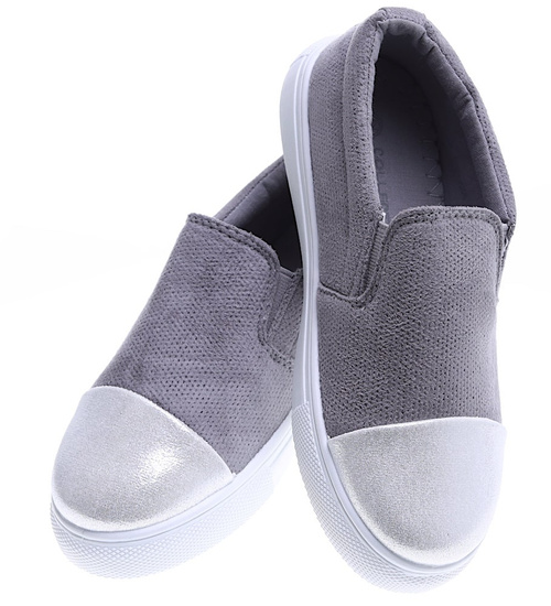 - Wiosenne trampki slip-on dla dziewcząt, wykonane z delikatnego zamszowego materiału odcieniu ciemnego szarości.
