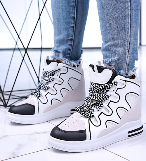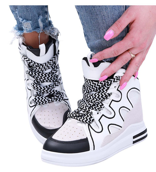 Sznurowane biało czarne trampki sneakersy na koturnie /F9-2 15779 D430/