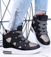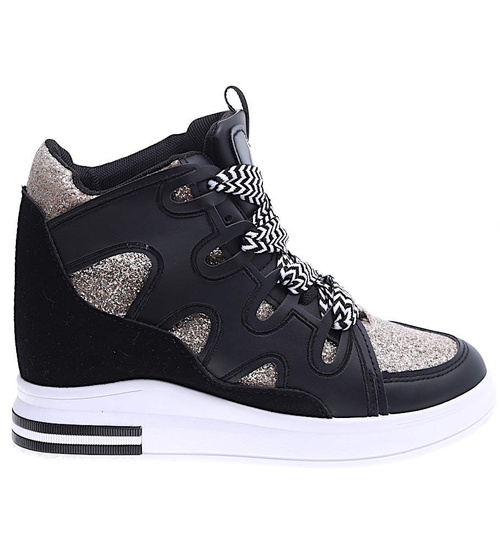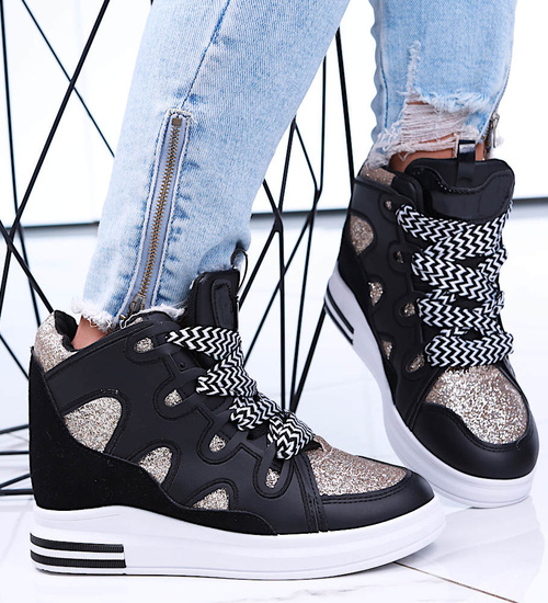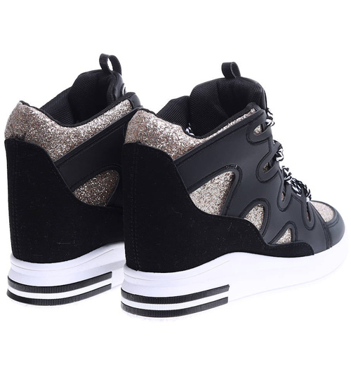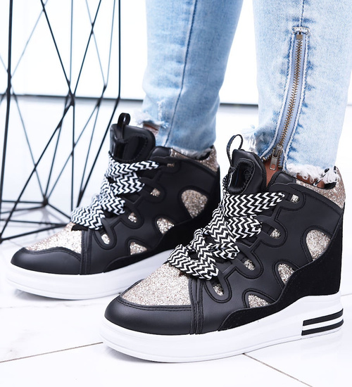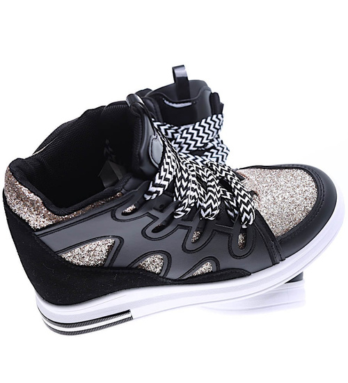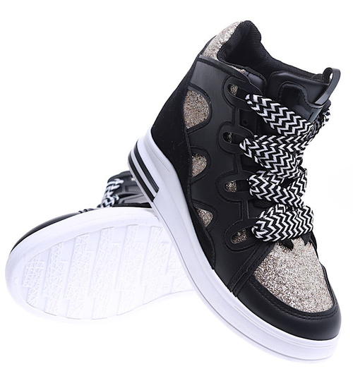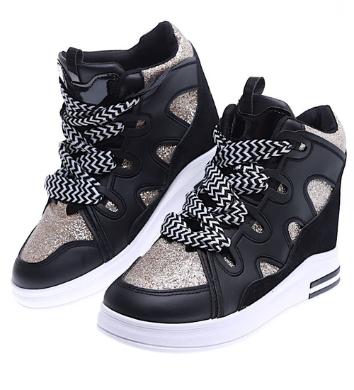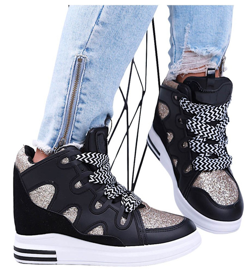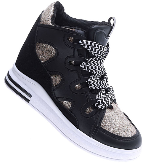 Sznurowane czarne trampki sneakersy na niskim koturnie /E5-1 15820 D430/