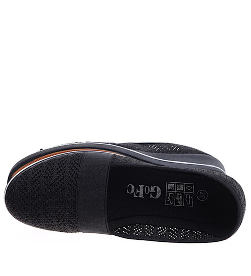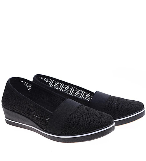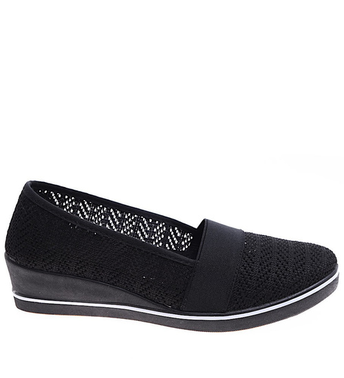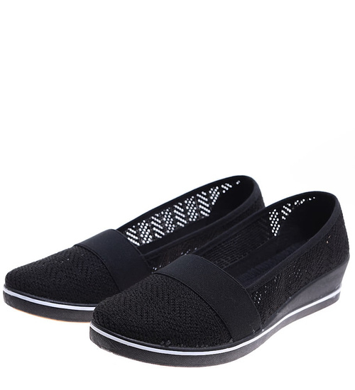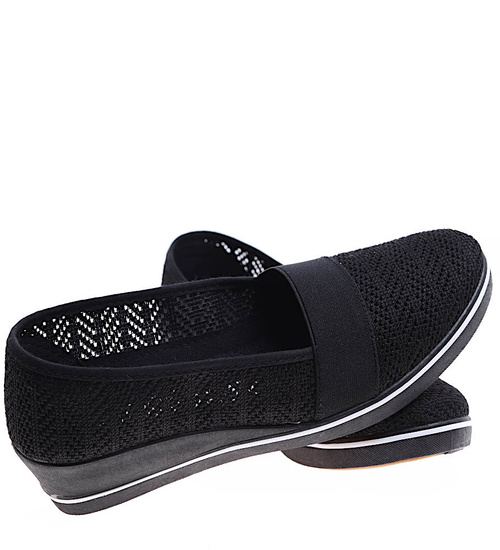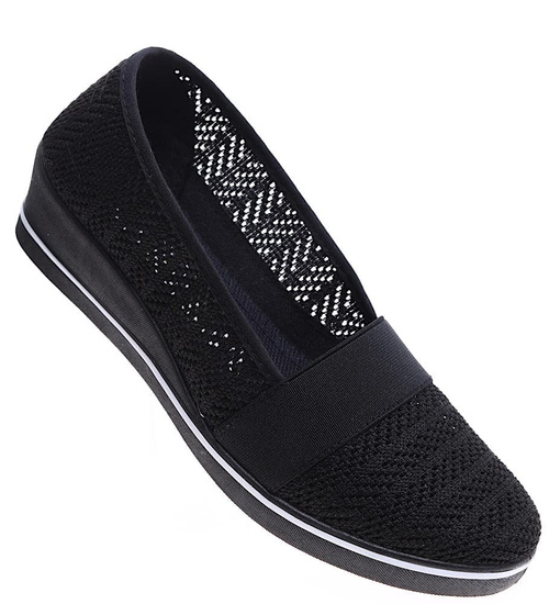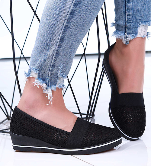 - Wsuwane tenisówki damskie wykonane z z koronkowego materiału w czarnym kolorze.