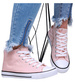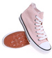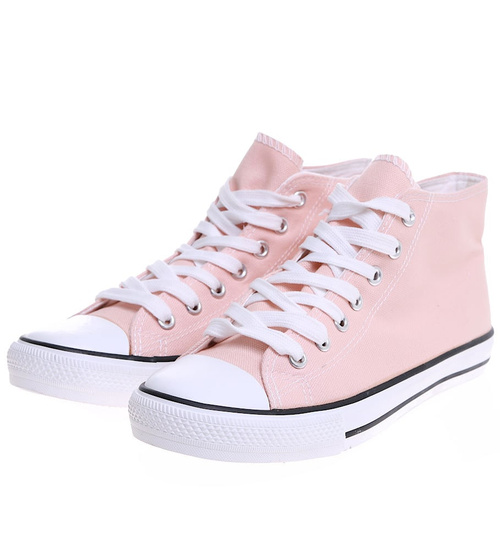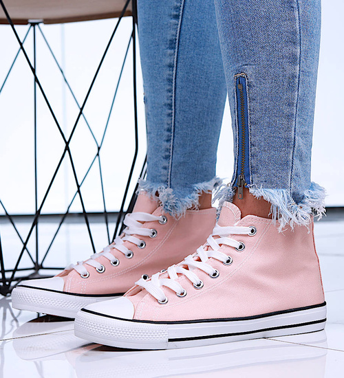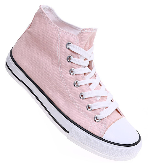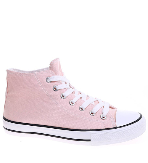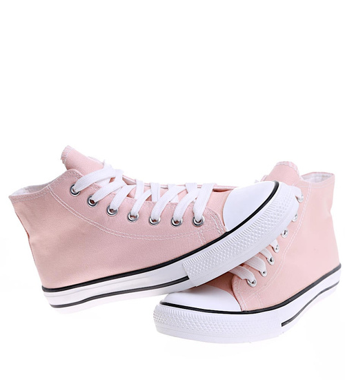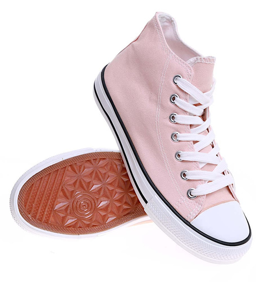 - Sznurowane damskie trampki z wysoką cholewką wykonane z delikatnej tkaniny w dziewczęcym, różowym kolorze.
