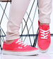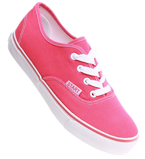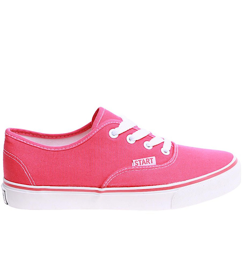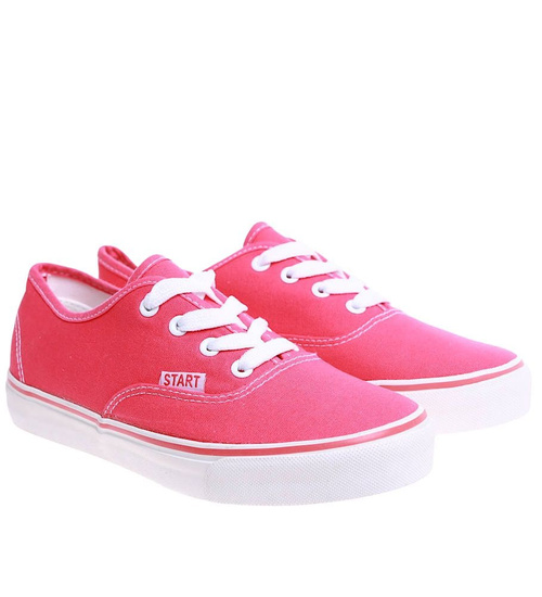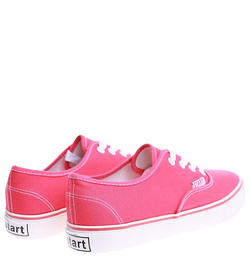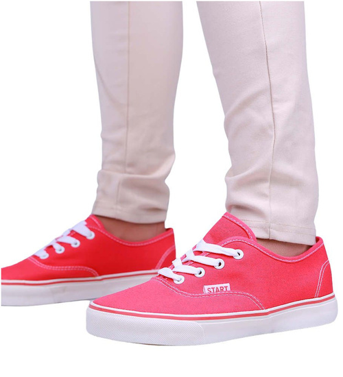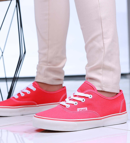 - Wiązane damskie tenisówki o niskiej cholewce, wykonane z delikatnej tkaniny w arbuzowym kolorze.