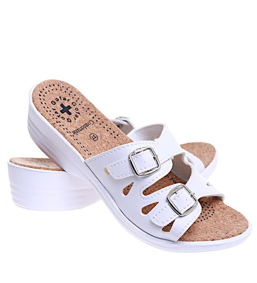 - Białe damskie klapki wykonane z miękkich materiałów.