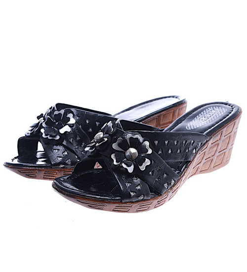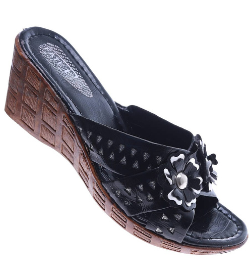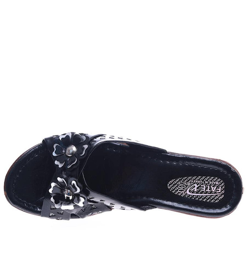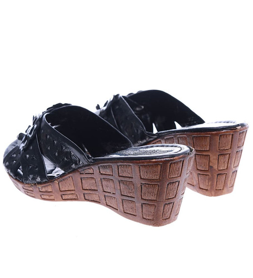- Czarne damskie klapki na koturnie wykonane z miękkiej skórki ekologicznej.