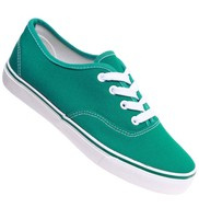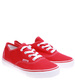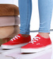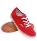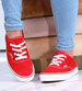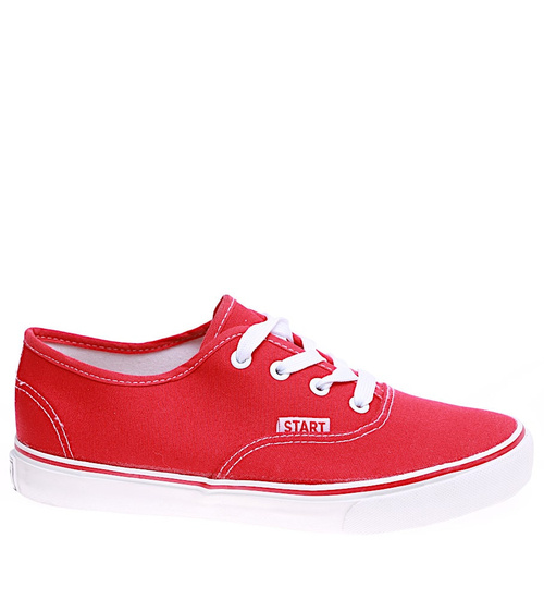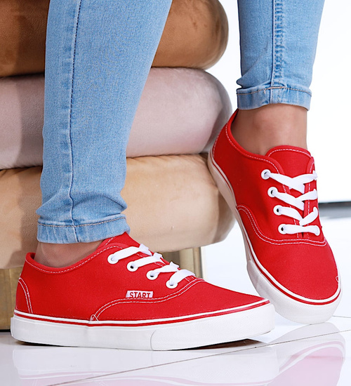 - Wiązane damskie tenisówki o niskiej cholewce, wykonane z delikatnej tkaniny w czerwonym kolorze.