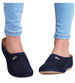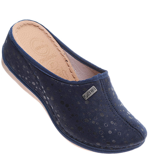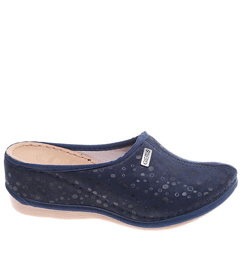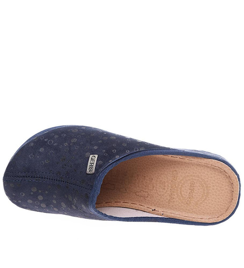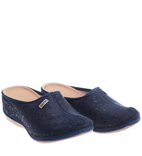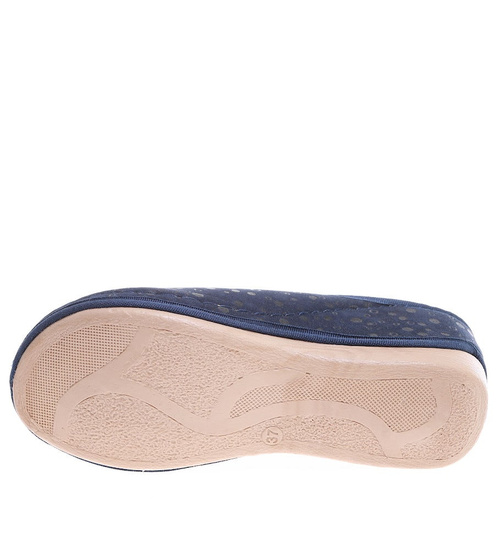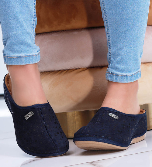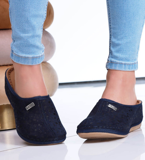 - Lekkie damskie klapki wykonane z miękkiego materiału zamszopodobnego w kolorze granatowym.