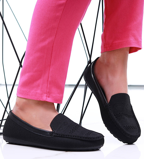 Czarne półbuty lordsy wykonane z miękkiego, ażurowego materiału.