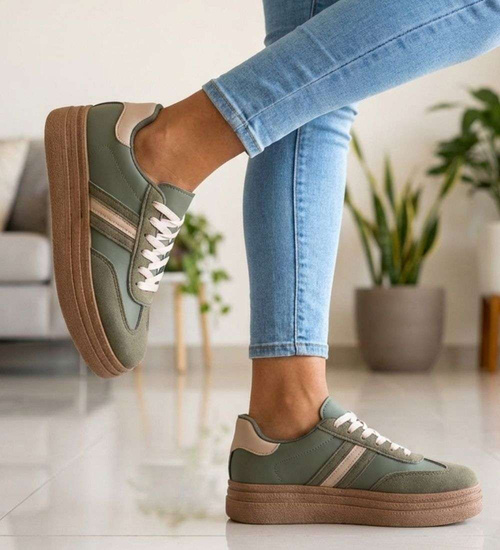 Postaw na wyrazisty styl i wygodę każdego dnia. Prezentowany model to modne zielone trampki damskie, które stanowią doskonałe uzupełnienie miejskich stylizacji. Sznurowane buty osadzone zostały na stabilnej, grubej podeszwie, która optycznie wysmukla sylwetkę, gwarantując jednocześnie maksymalny komfort użytkowania.