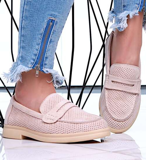 Beżowe ażurowe półbuty loafersy na niskim obcasie /G8-3 16054 T275/